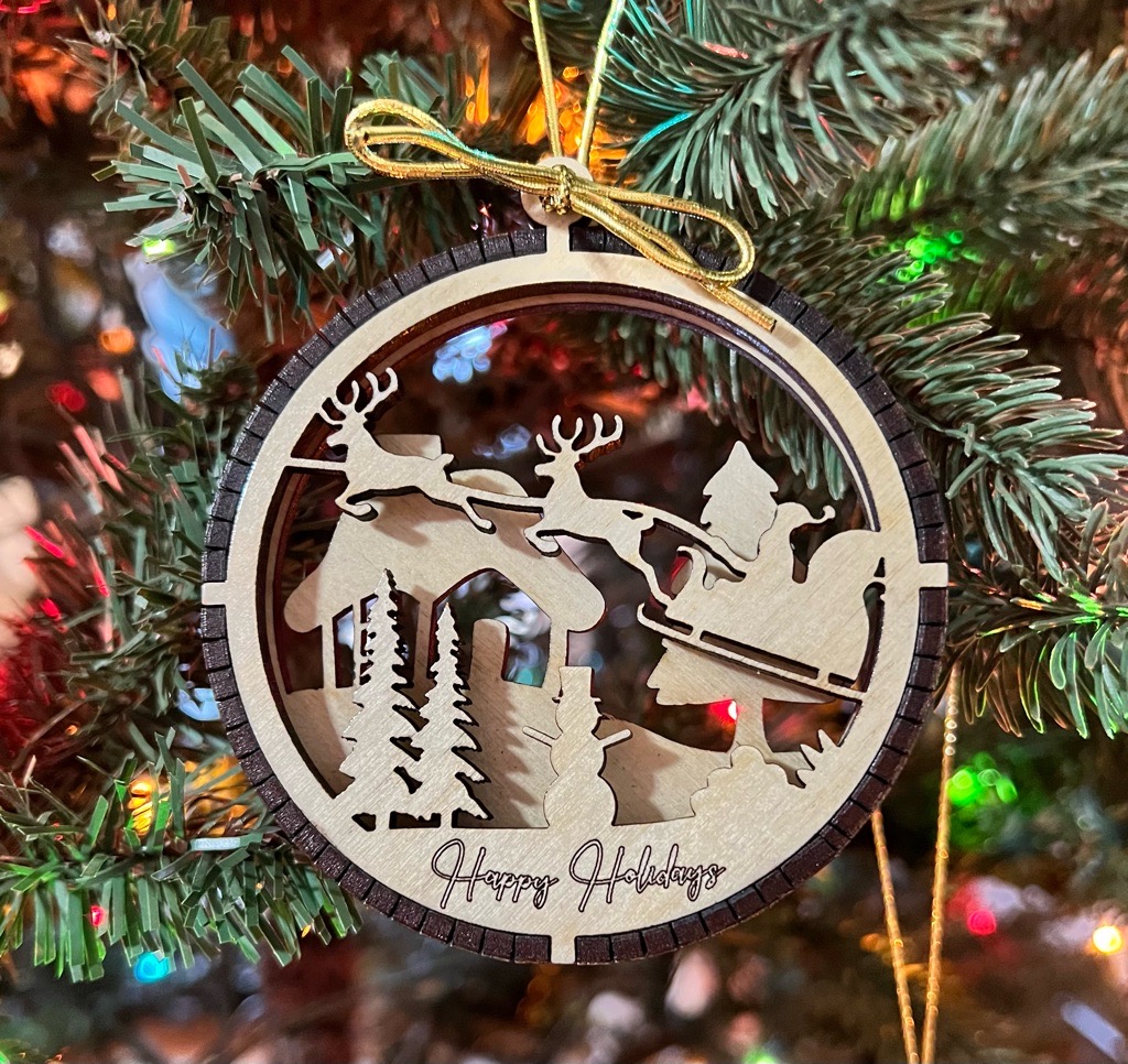 Made from Baltic Birch wood and cut on a laser. Each ornament is made from 4 pieces of Baltic Birch and glued together. These have a shellac finish. It hangs from a black cord.
