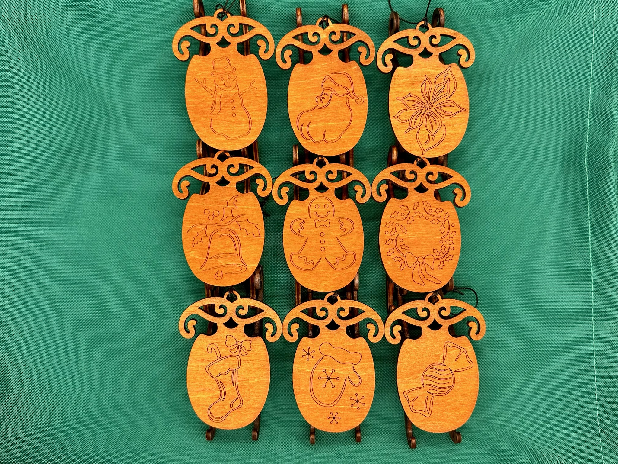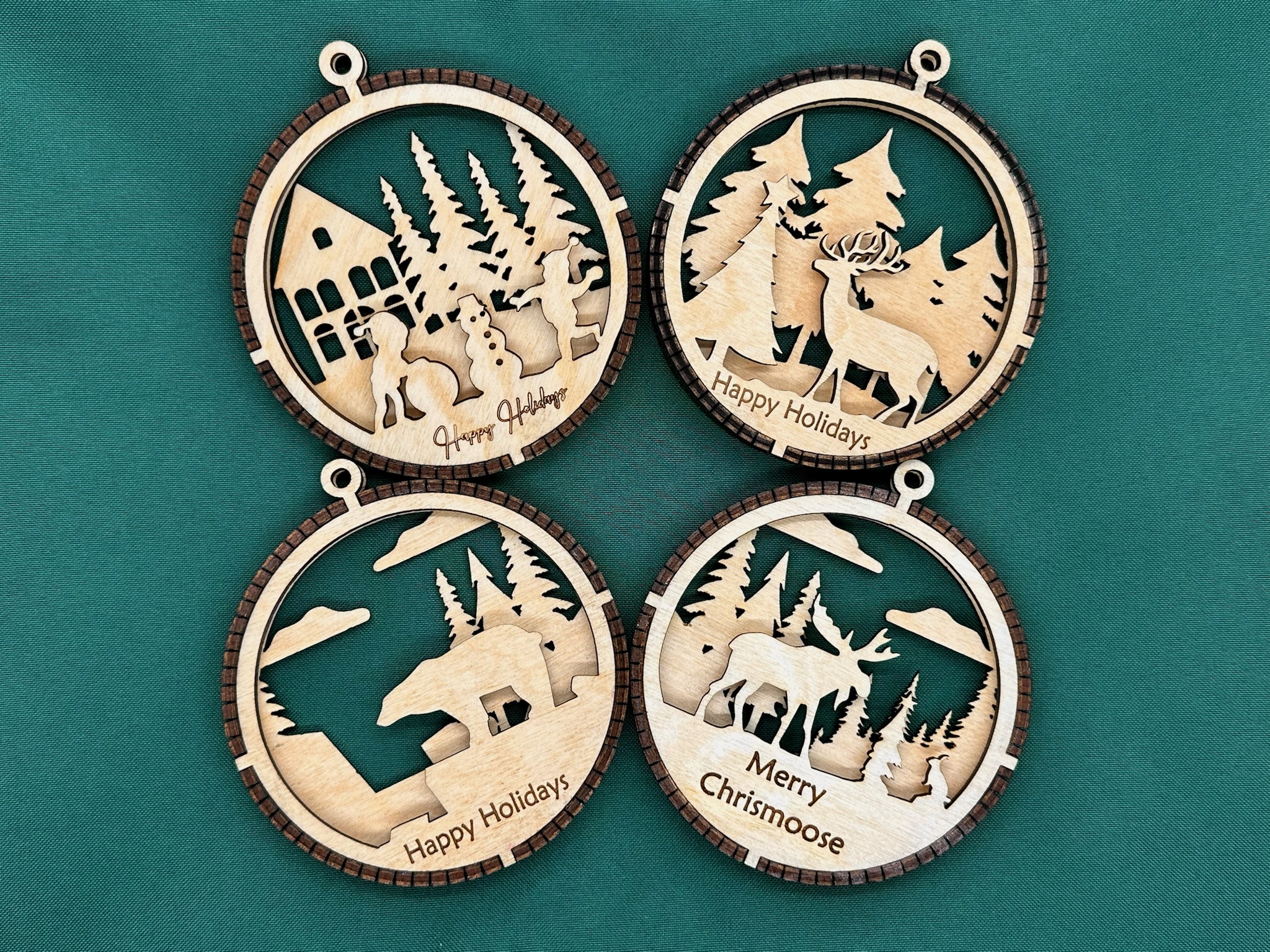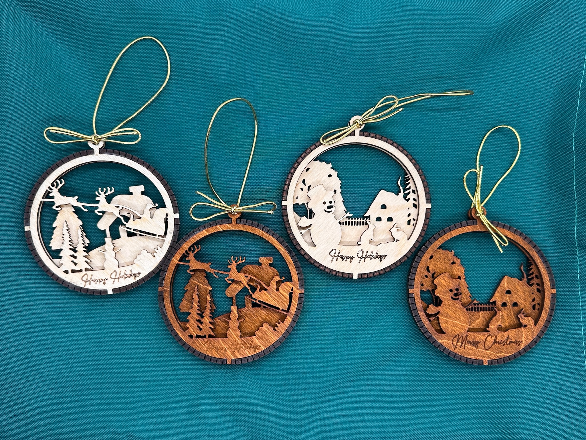 Made from Baltic Birch wood and cut on a laser. Each is made of 3 separate layers and glued together. They look as good from the front or the back. These are finished with a coat of shellac. These hang from a black cord.